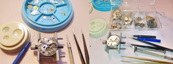 Далее все кропотливо собираем, в процессе сборки обнаруживается износ некоторых деталей, заменяем их из коробочки с запчастями на этот калибр часов.