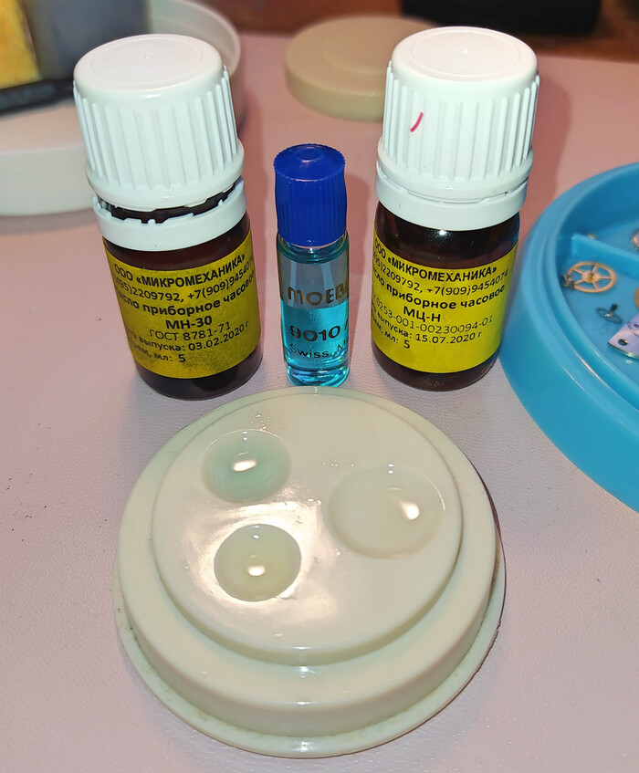 При сборке часов использую отечественное часовое масло от «Микромеханики» и швейцарское Moebius.