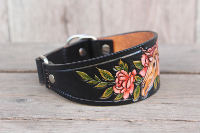 Ошейник 35мм шириной, с гравировкой. Фурнитура стальная, сварная. Кожа растительного дубления в 2 слоя и все это прошито контрастной коричневой нитью в тон гравировке.