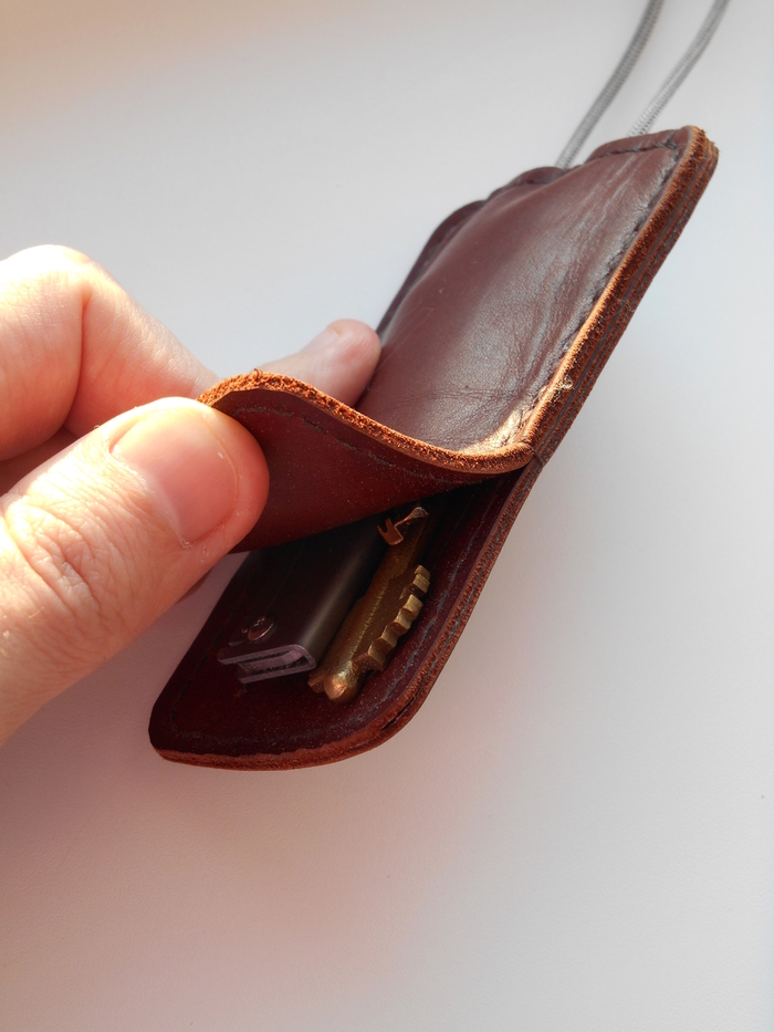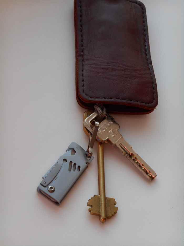 Кожа какой то краст, урезы не обработаны, нить какая то крепкая тонкая синтетика, ремешок попавшийся под руку, ключ от домофона между двумя слоями вшит, отверстия без пробойника делались по тетрадному листу в клеточку шилом. Тут 4 куска кожи, в продаже такого формата ключницы из двух кусочков которые превращаются в тряпочку со временем. В итоге ключи полностью внутри, сидят плотно, а самый большой плюс отсутствия кнопок и замков это то что её можно просто встряхнуть одной рукой и все ключи в доступе.
