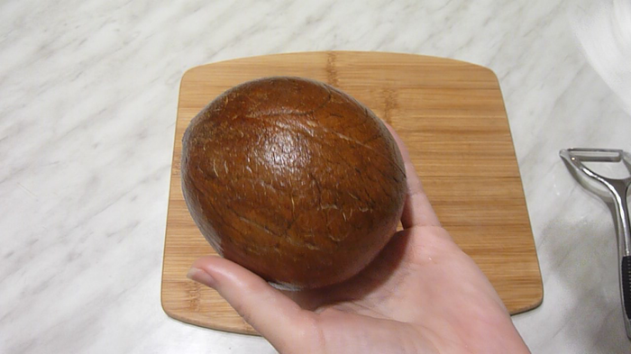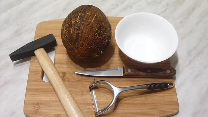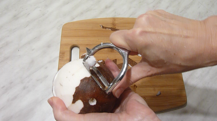 Я почищу кокос овощечисткой. Срежу верхний темный слой так, чтобы осталась только белая мякоть.