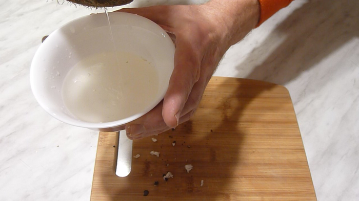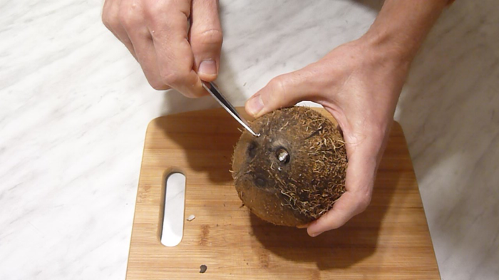 Слышно даже как выходит воздух. Лучше сделать два отверстия. Но, как правило, легко проделывается только одно. Остальные сложнее. Поэтому проковыряем побольше, чтобы туда попал воздух. Попробуем слить сок. Кокос можно слегка потрясти.