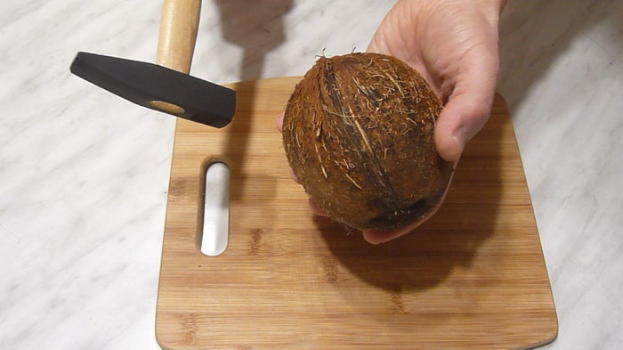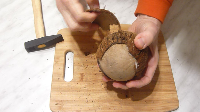 Когда у нас кокос уже пустой, можно приступить к разбиванию твердой оболочки. Бывает по-разному. Часто она отслаивается очень хорошо и ровно, а бывает, что отходит мелкими кусочками. На поверхности есть небольшой шовчик. По нему можно начать постукивать молотком.