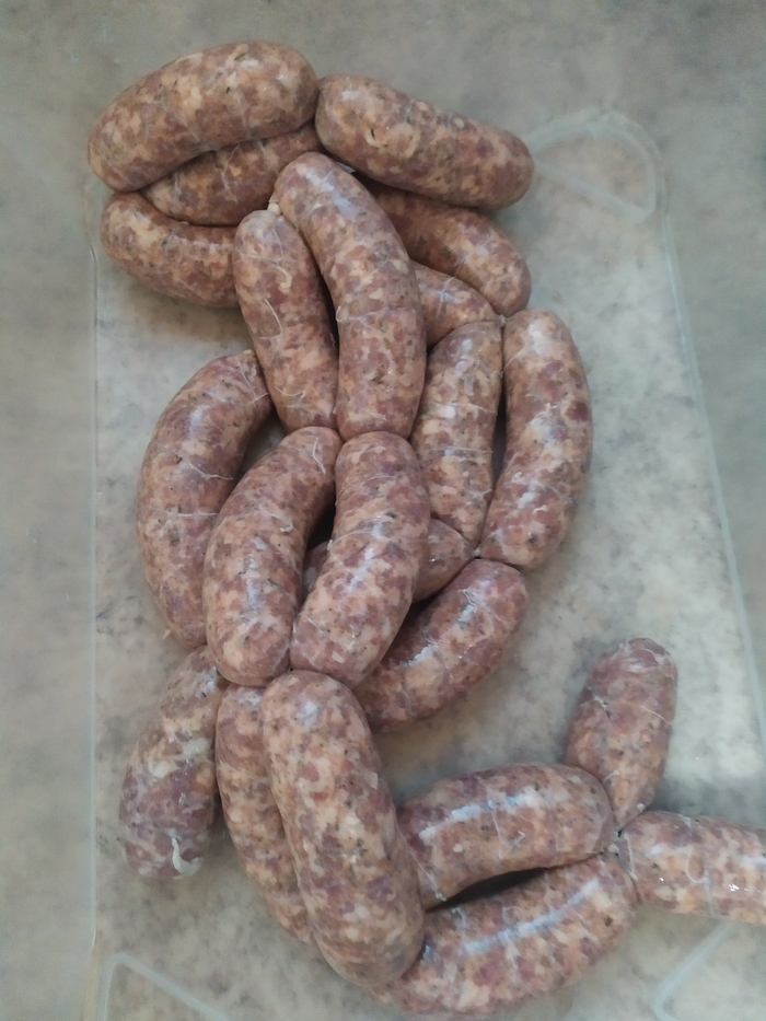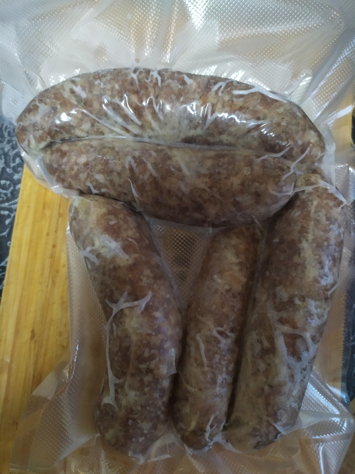 А вот уже готовые, проваренные и замороженные. После разморозки две минуты на мангале, гриле или сковороде и сочные, мощные, ароматные, истекающие соком купаты готовы. Идеальны вместо шашлыка, да и вместе с шашлыком тоже норм. Одной вполне, но в хорошей компании можно и четыре осилить после тарелки шулюма.