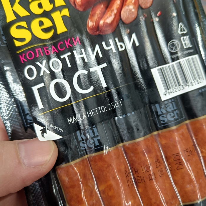 Интересно, как такой финт ушами соотносится с правилами Роспотребнадзора? Но может быть производитель хотя бы оставил сведения на своем сайте? Спойлер: нет. https://delikaiser.ru/product/kolbaski-okhotnichi-gost/