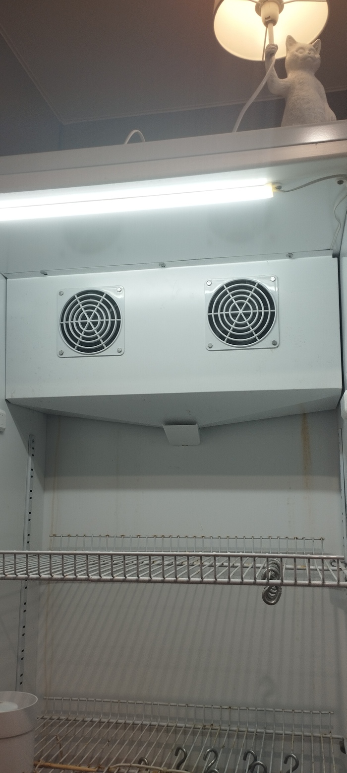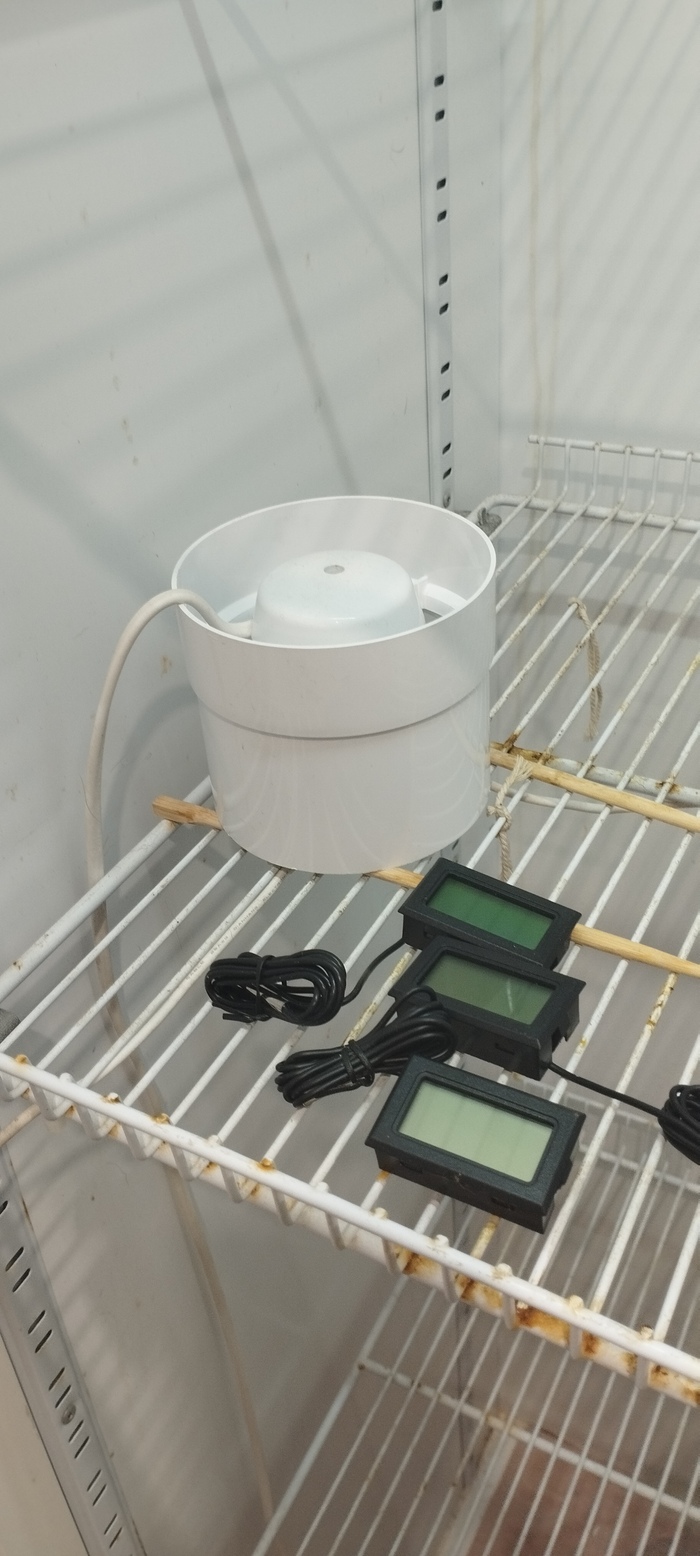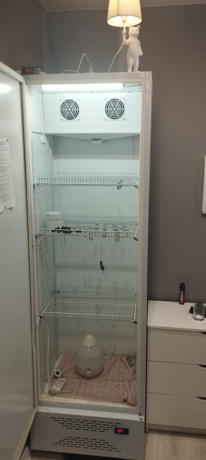 В камере установлена управляемая контролером розетка для вентилятора и увлажнителя, вентилятор простой канальный, увлажнитель просто "для дома". КРАЙНЕ важно использовать в такой системе ТОЛЬКО дистиллированную воду!!!!