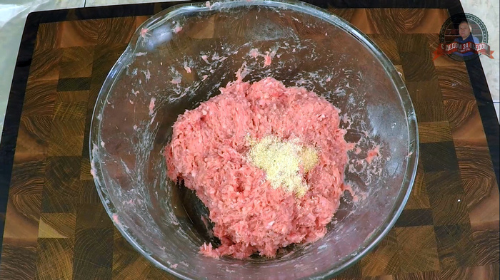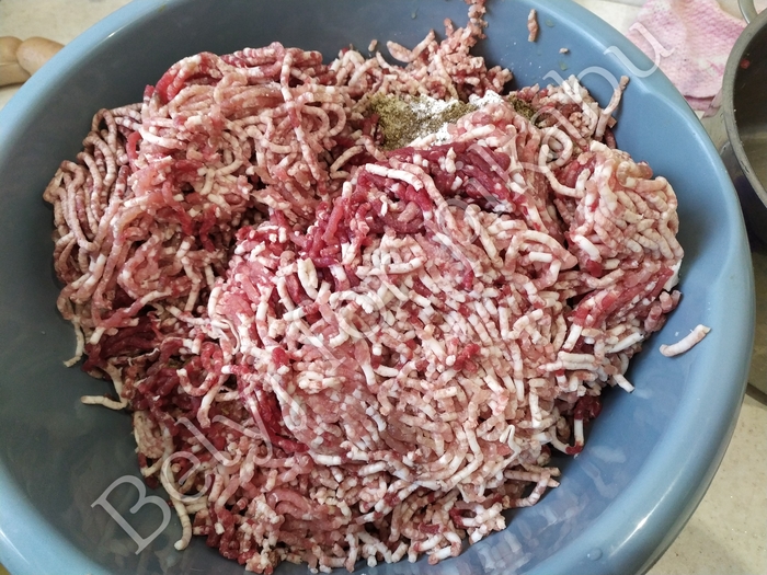 В фарш добавляем соль, приправу, холодное молоко и очень хорошо перемешиваем, можно воспользоваться миксером с насадкой для теста.