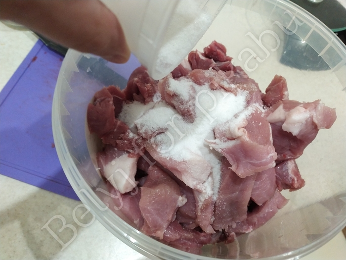 Мешаем не менее 5 минут. От нитритной соли мясо начнет густеть и становиться вязким, а так же приятно розоветь.