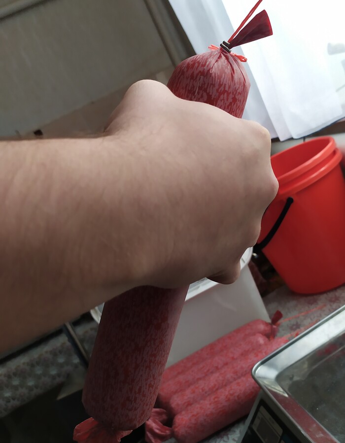 технология душирования: хватаем колбасу двумями руками и придушенную топим в холодной колодезной воде (штоб не переварилась и не испортился вкус ветчинности👌😁)
