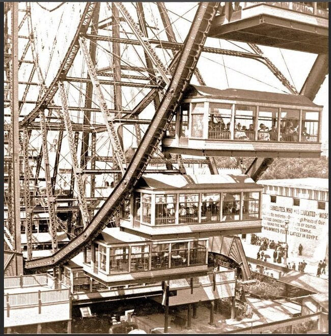 Огромная стальная машина была построена к открытию выставки, с диаметром колеса 75 метров. Весила махина около двух тысяч тонн и вращалась при помощи двух паровых машин мощностью по тысяче лошадиных сил каждая. К ободу крепилось 36 кабинок, в каждой из которых было по 20 сидячих и 40 стоячих мест и за один поворот, занимавший целых двадцать минут видами могли наслаждались 2160 пассажиров. Даже будучи в четыре раза меньше сооружения Эйфеля, ключевая достопримечательность выставки была выше любого небоскреба девятнадцатого века.