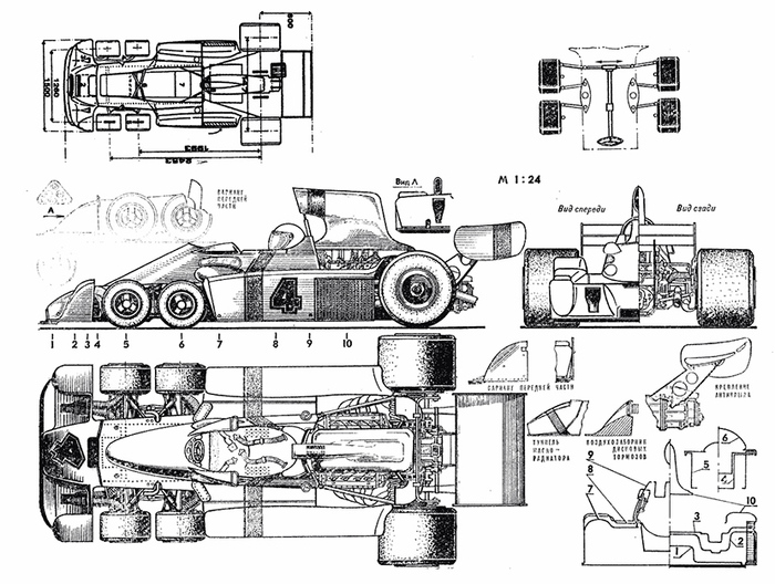 Единственное, что, по мнению Гарнера, могло улучшить показатели болидов Tyrell, – это снижение площади лобового сопротивления. Конструктор считал, что причиной турбулизации потоков встречного воздуха являются открытые колеса машин. Чтобы увеличить их скорость, колеса было необходимо чем-то прикрыть. Однако Дерек не придумал ничего лучше, чем уменьшить диаметр колес, превратив их в крошечные слики. Чтобы авто, «обутое» в такие «катки», не потеряло устойчивость, автор удвоил количество осей. Так получился сенсационный Р34 Tyrell.