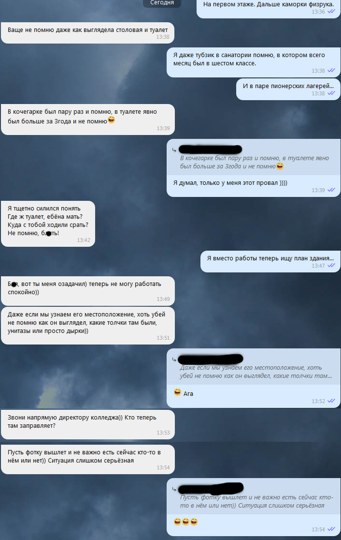Начитался тут в комментариях про толчки разные-разнообразные и стрельнуло мне в голову, что не помню как выглядел туалет в колледже, где я учился. Решил обратиться к другу-одногруппнику... Ситуация слишком серьёзная! =)