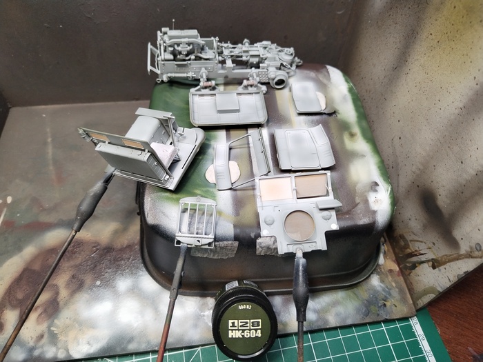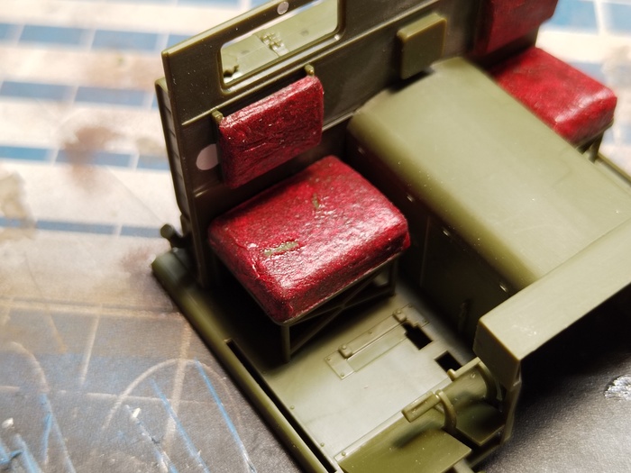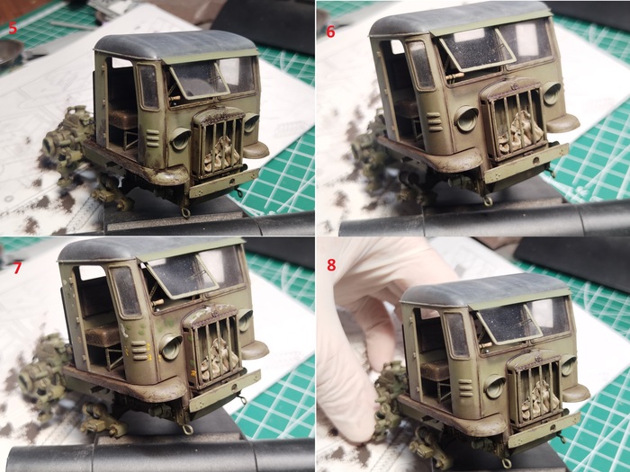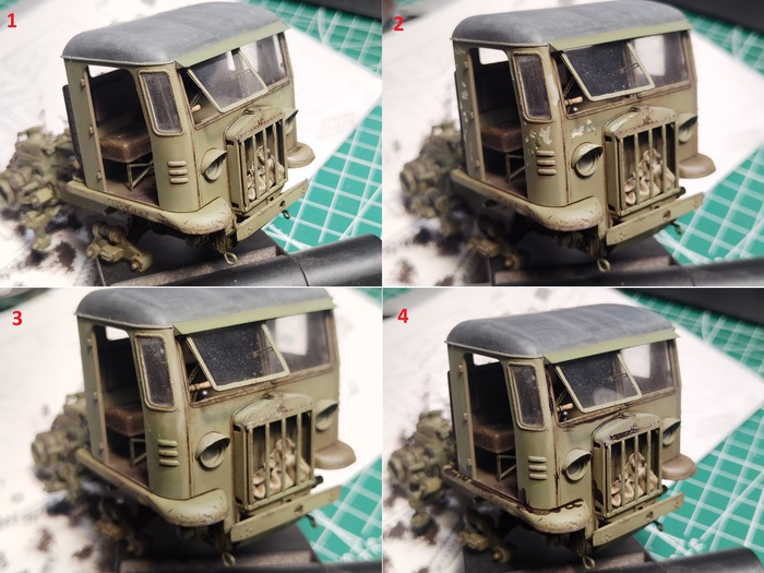 Собрал и выкрасил кабину. Попутно поработал с ней маслом — высветлил и затемнил, сделал сколы и смывку. Всё по классической схеме, ничего сложного не придумывал.