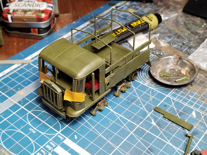 Промежуточный итог со сборкой ходовой, кабины и кузова. Дальше меня ждал самый трудный этап — надеть тент, не сломав его, покрасить, затонировать и покрыть пылью.