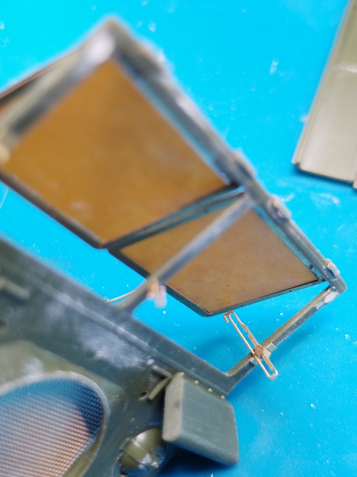 Интересным моментом стали откидывающиеся лобовые окна от «Микродизайна». Необходимо собрать «бутерброд» из внутренней и внешней рамки, а между ними — прозрачная пленка. Клеить, понятно, на суперклей, и права на ошибку нет — иначе очень легко испортить пленку. Плюс сами крепления форточек в открытом состоянии тоже тоненькие и непростые: шарнирный узел не сделан («МД» просто забили делать это адекватно), а петли сверху тоже не стали показывать — клейте как знаете. Короче, над этим узлом пришлось попотеть.