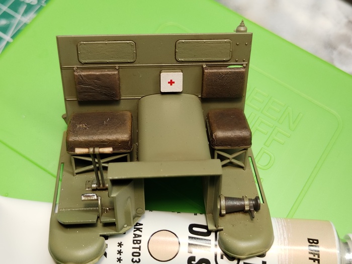 В качестве эксперимента взял 4БО от отечественного производителя «128». Скажем прямо: цвет неплохой, но краска не понравилась. Довольно сухая «нитра», сильно пахнет и сохнет на лету — разбавлять надо очень жидко, чтобы не было шагрени. Фирменному растворителю не хватает ретардера, чтобы продлить время жизни краски. Раскрасил интерьер, добавил цветное травление аптечки.