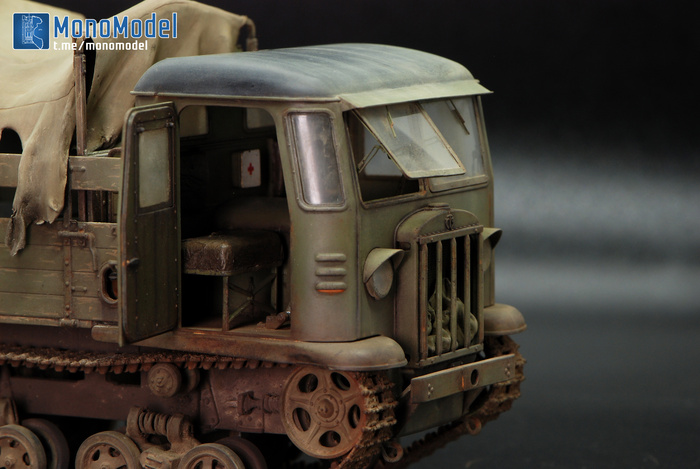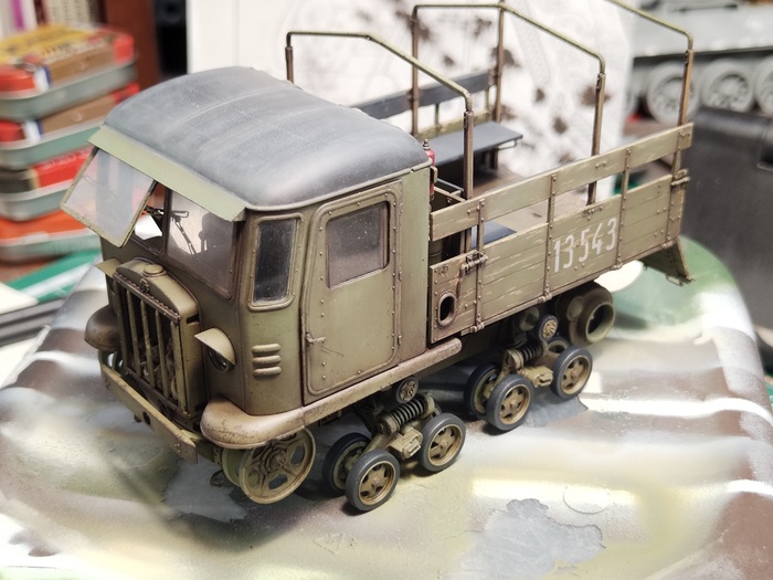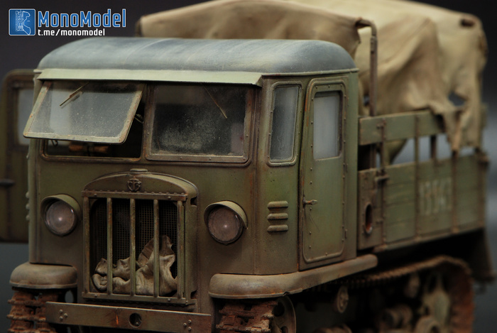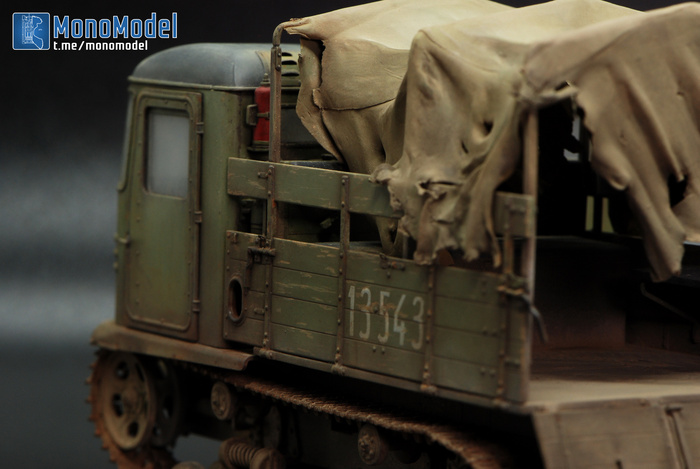 Честно говоря, пожалуй, первая моя работа, которую было неохотно доделывать. На финише никак не удавалось добиться того эффекта в окраске, который хотелось. Тент получился не совсем таким, ржавчины по итогу многовато, а пыль на стёклах — хотя переделывал раз пять — тоже не идеальная. Но модель нужно было закончить.