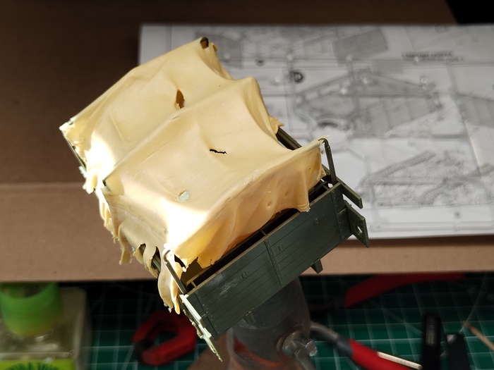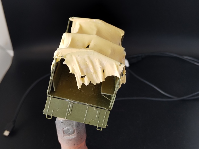 Еще одной фишкой своей сборки решил сделать тент из двухкомпонентной шпатлевки. Да, штатный тент с окошками неплох, но мне не хотелось кастома, плюс задумка — заброшенный СТЗ на обочине. Пришлось сваять его по форме кузова, наделать складок и дырок. СТЗ будет стоять под наклоном, не забыл придать тенту соответствующий угол провиса.