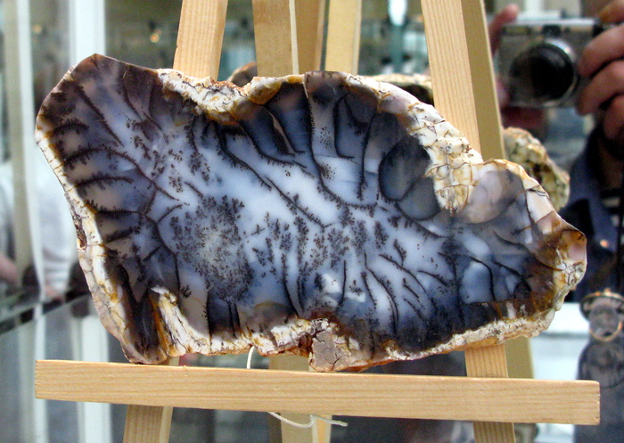 Дендриты гидроокислов марганца и железа в пейзажном халцедоне. Видна отчетливая граница, выше которой растут дендриты гидроокислов марганца, ниже - железа. Месторождение Алатакыр (Шыбынды), Казахстан. Фото автора, выставка "Мир Камня"