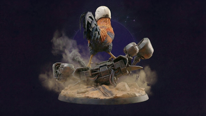 Но дальше встал вопрос — а на чём он будет стоять? Просто на земле или на камешке — как-то скучно . И как раз накануне мы с пати долго и нервно мочили одного рокетира — летающего робота, который с воздуха достаёт. И тут пришла гениальная, как мне кажется, мысль: а что если сделать целую сцену? Пусть наш Плюшкин стоит в крутой позе на поверженном рокетире, как на трофее! Наденем на него ещё какой-нибудь прикольный шлем от скина рейдера из игры. А вокруг — песок, обломки, в общем, все по лору вселенной!))