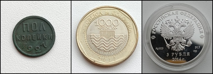 Еще интересны монеты с необычными номиналами, как советские пол копейки или современные 3 рубля, самый большой номинал в коллекции - 1000 колумбийских Песо.