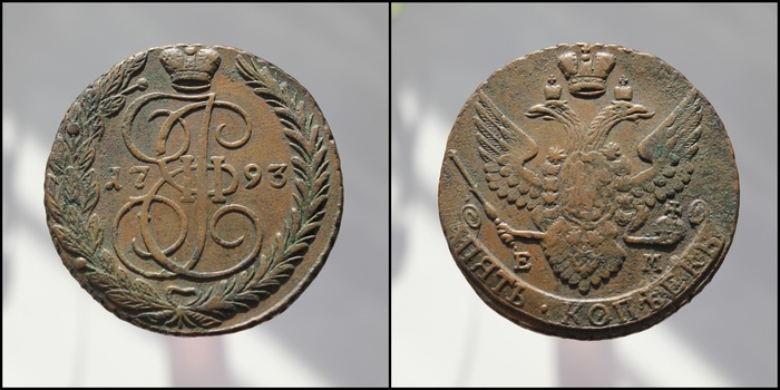 Двигаясь по критерию размера меняем вектор на противоположный - Екатерининские пятаки. Это огромные тяжелые медные монеты, производившиеся в 1763 – 1796 годы, с диаметром чуть больше 4 см и весом в 50 грамм.