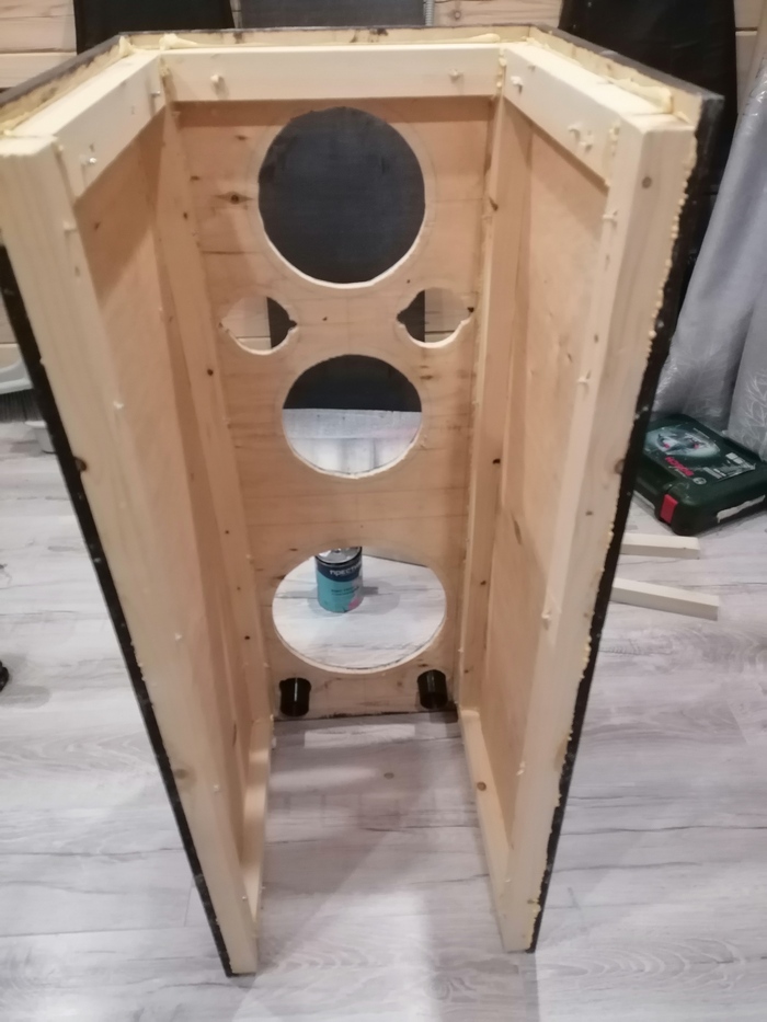 Процесс сборки короба был довольно прост, отступил от края фанеры 5 см, поставил саб, обвел его по кругу, отступил 5 см, отрезал. Вот и получился фронт моей будущей колонки.