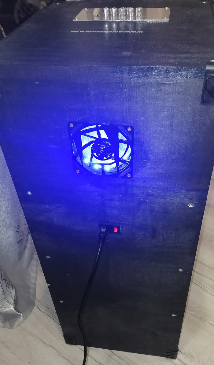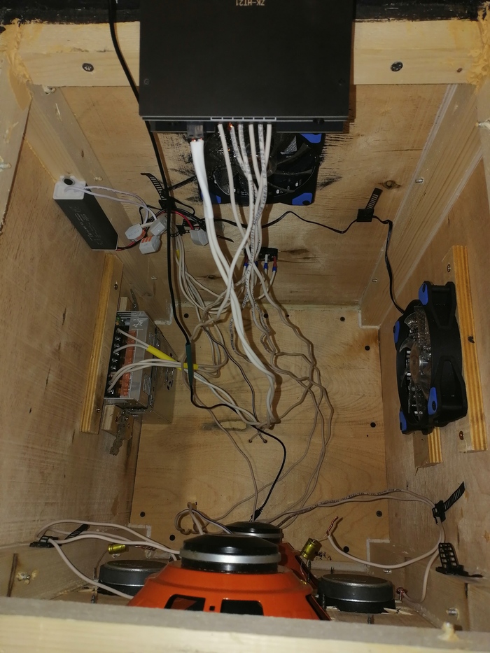Также поставил пару вентиляторов в отсек с блоком питания и усилком, но это не обязательно вообще. Вентиляторы запитал от БП на 12В, 2.5 А.
