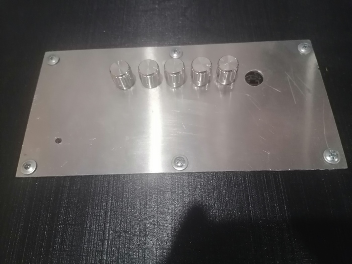На ВБ заказал алюминиевую пластинку, просверлил в ней отверстия для крутилок усилка, и закрепил их гайками.