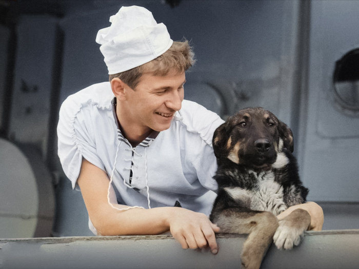 Мальчики с собакой. В камеру смотрят овчарка по кличке Карат и 12-летний гость из Москвы - Володя Высоцкий. Украинская ССР, г. Гайсин, 1950 год.
