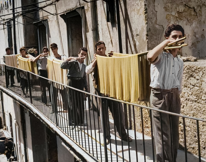 Молодые люди, работающие на макаронной фабрике, несут стержни пасты в сушильные камеры. Италия, 1947 год.