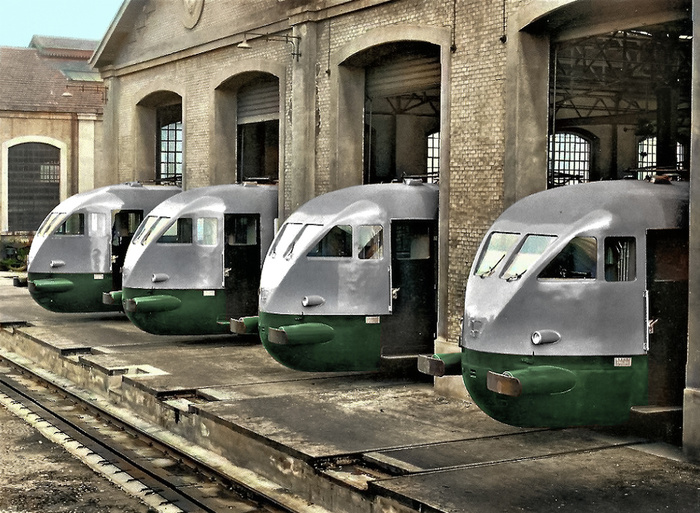 Рельсовый цеппелин (нем. Schienenzeppelin) и скоростной поезд на паровой тяге встретились на станции. Берлин, 1931 год.