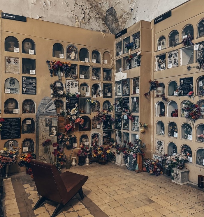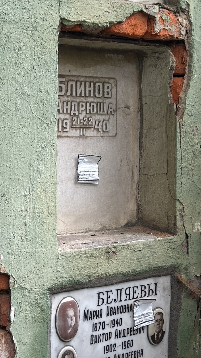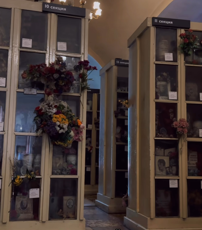 Поражает факт, что стены разваливаются, на многих ячейках висят призывы родственникам обратиться в администрацию, чтобы оплатить аренду ячейки (6 000 рублей в год), а также обсудить будущее урны.