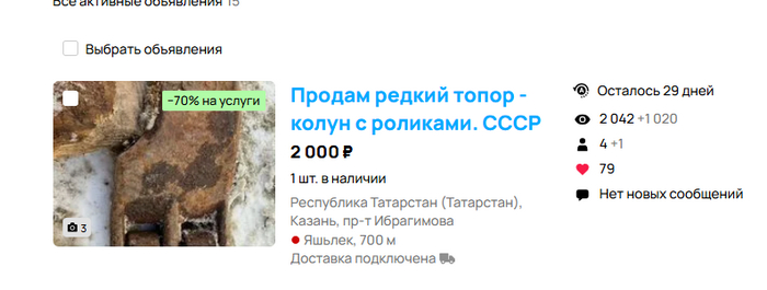 Топор, почти сразу забронировал человек. Но потом, какой-то шквал просмотров и звонков. Предложили уже х2 от объявленной цены. Но я уже обещал - поставил в резерв.