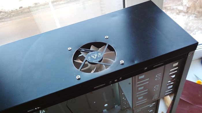 - а потом по той же технологии поставил еще один 120мм. кулер в боковую панель (и тоже впоследствии прикрыл решеткой):