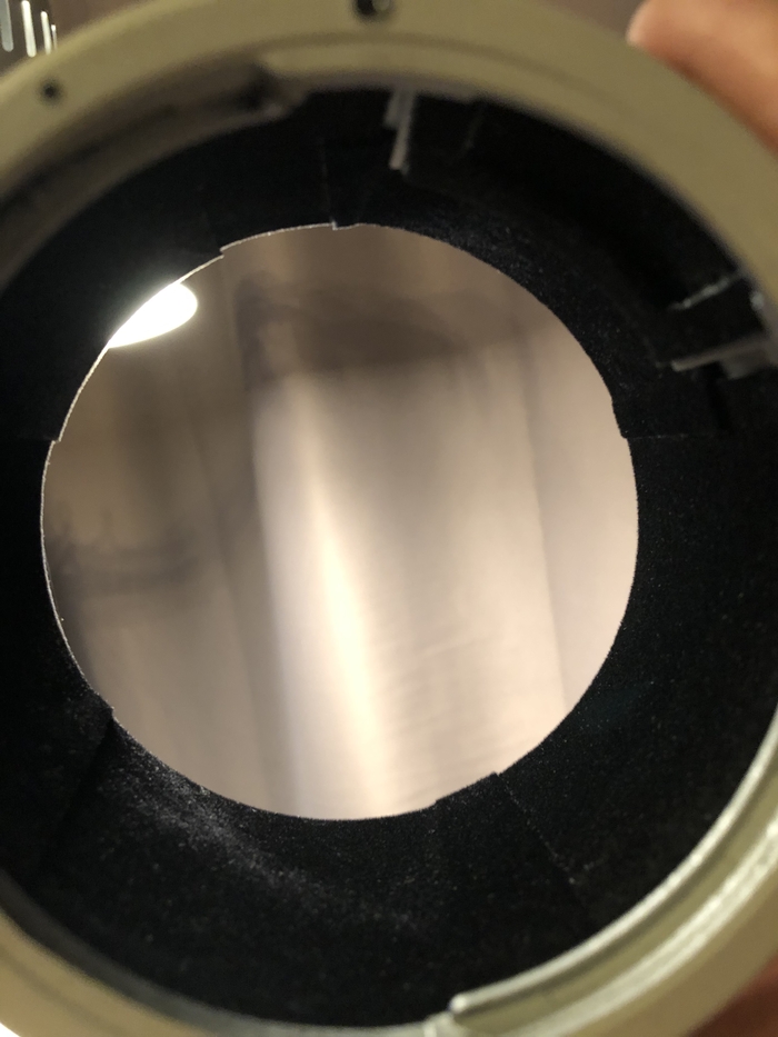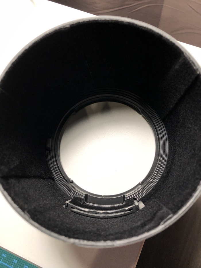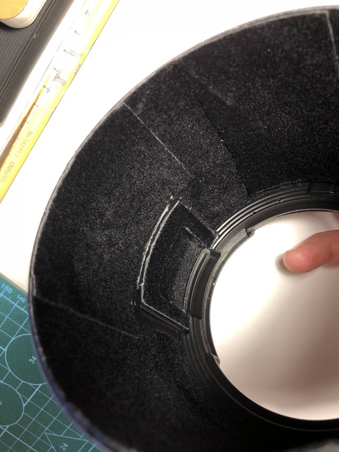 Обклеивал бархатным подкладом самоклеящимся на бленду для Canon EF 100-400mm f/4.5-5.6L IS II. Родная бленда с окошком для фильтров, которая уже с чернением, утеряна. Стоит новая не менее 4 тыщ.. Эта куплена на алике за 700 р., тоже с окошком. Стоит этот бархат копейки, результат меня устроил.