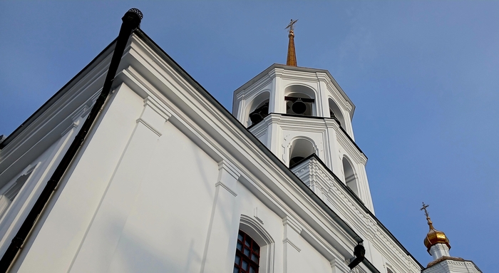 Центральная часть здания венчается высоким куполом, а на углах расположены меньшие купола.Фасад украшен декоративными элементами, а купола венчают ажурные кресты.