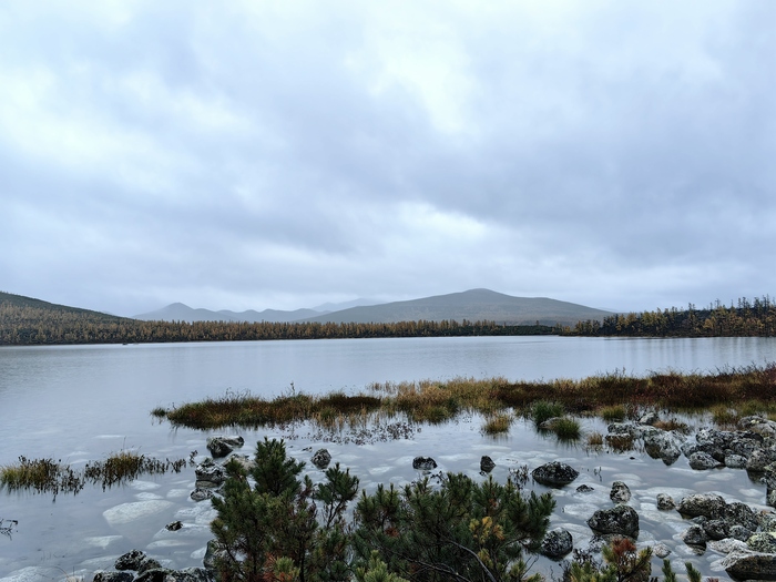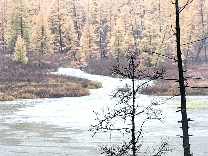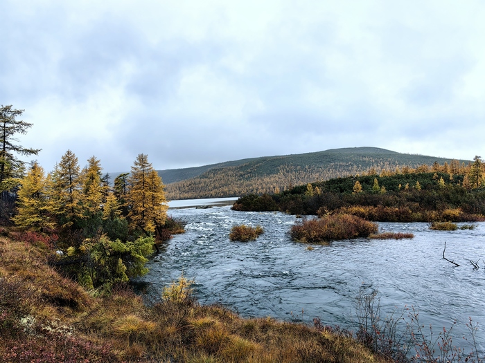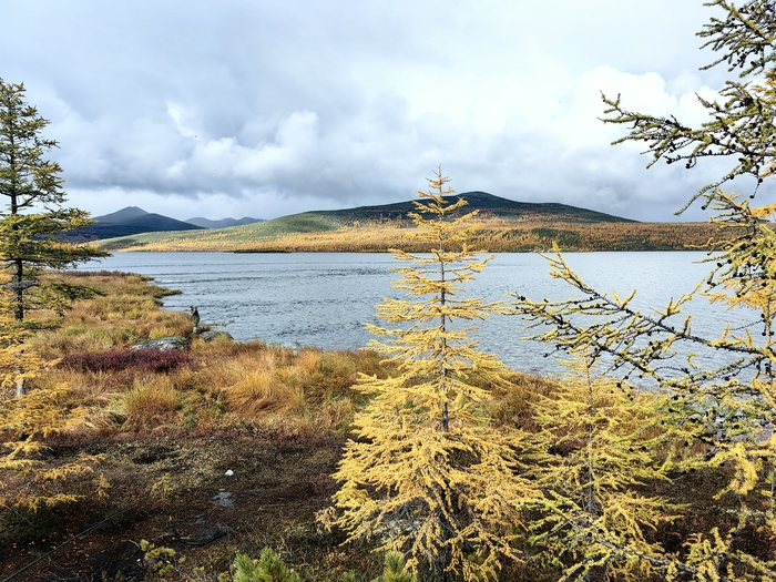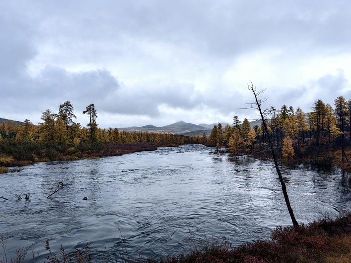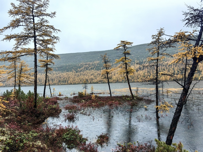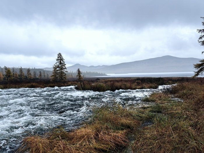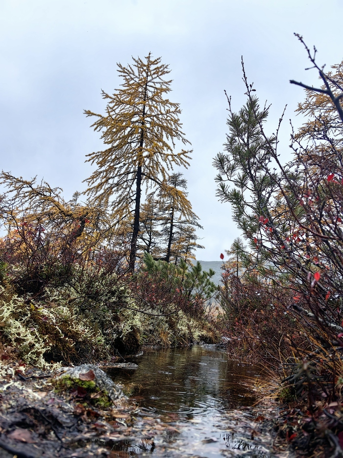 Дождь не прекращается. Решили идти до начала озера, в надежде что погода нам улыбнется и откроет всю грандиозность этой местности. По пути в обилии встречаем голубику и грибы. Озеро с прозрачной водой, великолепные виды золота – это лиственницы в своем самом соку. Чаще стали попадаться болота, тропа у самого озера в воде, потому что уровень поднялся на 40-70 см. Иногда находили аналоги, иногда прорывались вне тропы. Но в итоге дошли. Теперь раздумья. Идти до подножия или в лагерь. Думать много не стали – в лагерь. Путь обратно был не менее живописным. Сделал пару фотографий ручья Неведомый. Эх, какая же тут наверное рыбалка, подумал я и продолжил путь ведя группу.