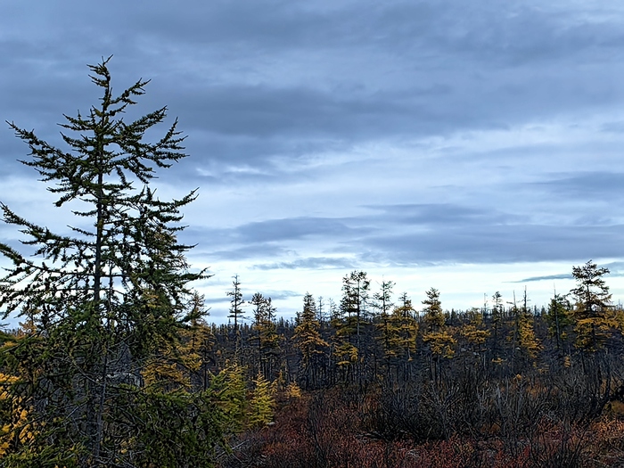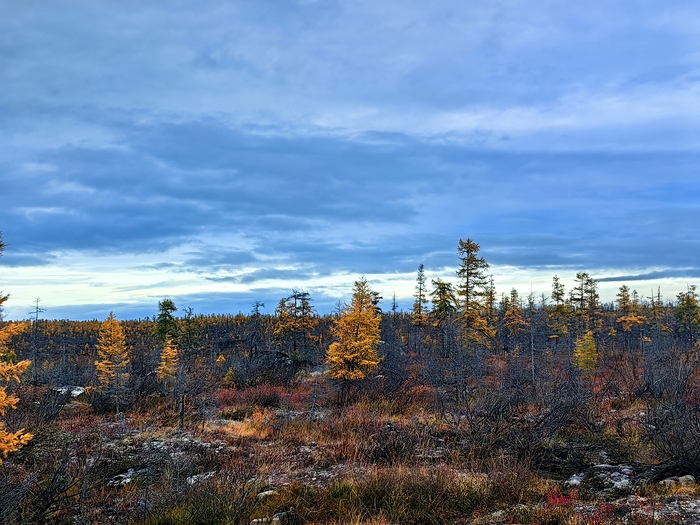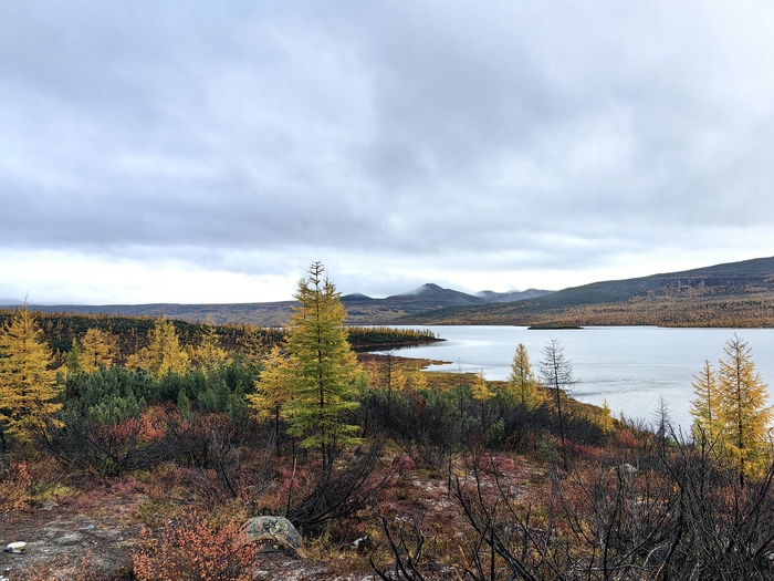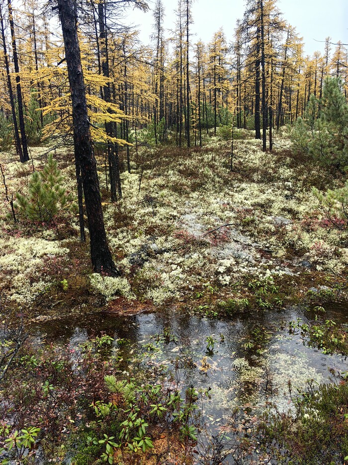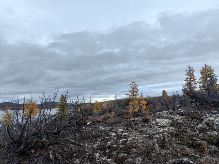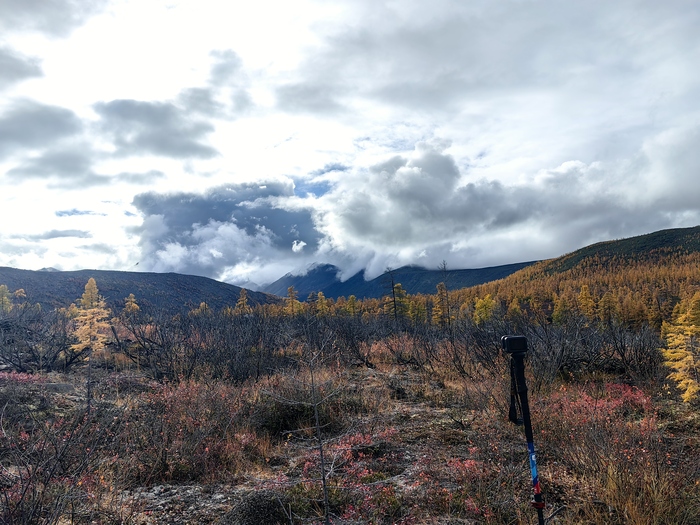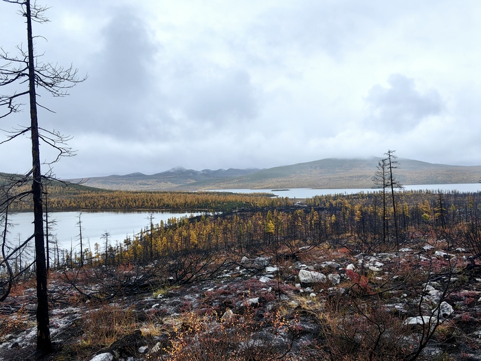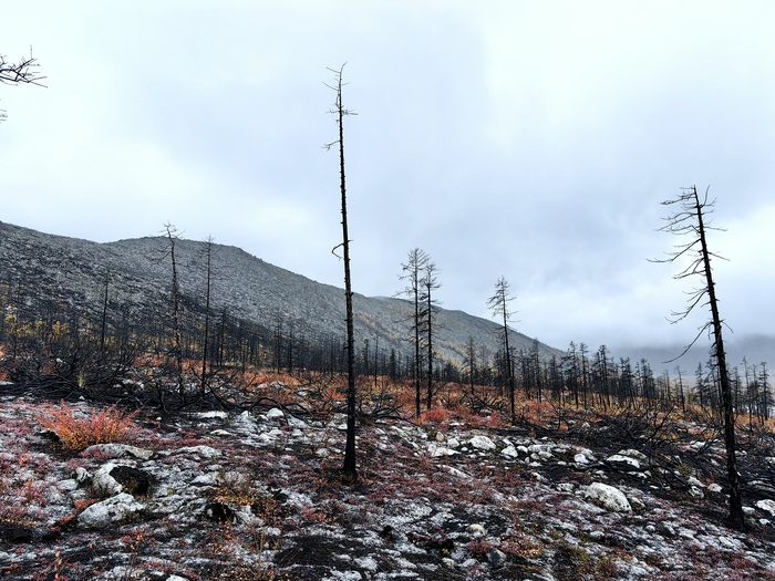 Это программа минимум, до Озера идти около 4 км, по прямой. В идеале, надо пройти 12 км до подножия пика Абориген, это в одну сторону, т.е. 22 км за день. Не загадываю вперед, направляю на цель – озеро Невидимка, её начало, а там посмотрим. В путь идем под дождем, видимость средняя, видны ближайшие горы и вершины, дышащие могуществом. Мы идет вдоль сильного потока Неведомого, поднимаясь по течению, доходим до начала озера Соседнее. Решаемся подняться повыше, дабы идти по болоту совсем не комильфо) А наверху, нас ждали обильные участки вызженного леса. Это остатки кедра после большого пожара. Выжила трава,и обильно растет брусника. Преодолеваем метр за метром, иногда встречая болота нагромождения курумника. Атмосфера мистицизма. Очень крутое. Идти по мертвым деревьям с живым мхом и ягодами.