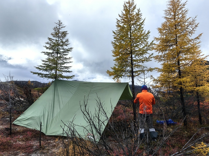 Вот и лагерь, вот и камни которые приютили нас, проверил заготовленные ветки – не намокли, и даже значительно подсохли. Поднимается вопрос, делать тент или нет. Решаем – делать. Натянули его он большой, здорово защитил нас от дождя. Мы перенесли все запасы дров под него и даже мангал который там был.