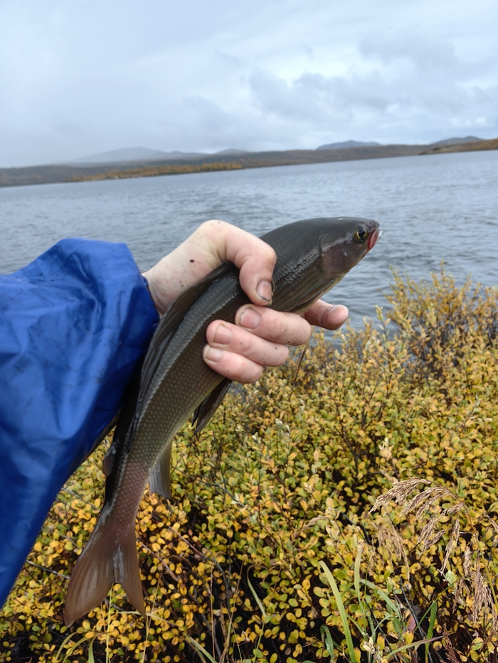 Минут через 15 как мы натянули тент, прекратился дождь. Решили дать время для просушки дров и спустились вниз на рыбалку. У меня был опыт ловли хариуса, поэтому сказал друзьям где ловить – на перекатах и в местах где впадает ручей. Из-за поднятого уровня воды, подобраться к таким удобным местоположениям – затруднительно. Приходилось буквально идти по веткам ивы, а внизу вне веток глубина 1 и более метра, иногда с сильным течением. Распределились, вроде бы все у каких то выходом с течением. Мы начинаем рыбалку. Рыбу которую поймали – отпустили. Хариус здесь какой-то более черный, нежели в Башкирии где я его ловил. Красивый.