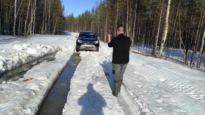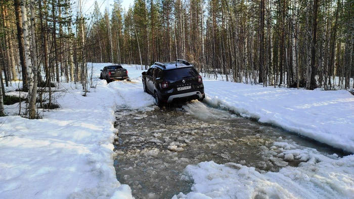 Освежившись, я зарядился большим количеством энергии, нашёл ресторан в Кандалакше, построил до него точку и поехал. Ресторан называется «Причал 22» — это местное хорошее заведение с удобным спуском на воду, где можно приехать, спустить свой катер на воду, поесть и сделать все дела, которые нужны морякам. Заходя вперёд, это место подарило мне в итоге массу впечатлений и новых друзей. Приехав, ко мне подошла девушка, которая, увидев моё судно на крыше, спросила: «А вы качили на Кольском?» Я ответил, что, к сожалению, пока нет и скорее всего я уеду домой сейчас, так как нужно возвращаться на работу. Поев и напитавшись энергией, я разговорился с девушкой — звали её Юля, и она опытный каякер, интересная творческая личность. Юля водит группы по Кольскому, недавно вернулась с экспедиции вокруг Рыбачьего, что меня воодушевило, и мы разговорились. После такой дороги до Териберки и такого сильного знакомства я решил ещё остаться на один день и съездить в места, которые мне Юля посоветовала на южном берегу Кольского. Попрощавшись с новым другом, я поехал изучать полуостров. В первое место я решил поехать в этно‑музей Тони Тетериной — интересное место и интересно в него попасть; дорога проходит по берегу моря, и проехать можно только на отливе. Я же приехал вечером, и дорога встретила меня большой речкой.