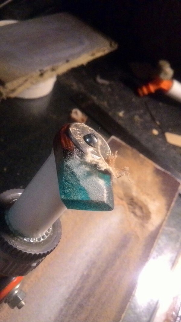 В общем, процесс залития я как всегда не сфотографировал, придать общую форму и выпилить отверстие я думаю тоже понятно как. Но вот видите капельку в основании смолы? Знаете что это? Это заплатка) К сожалению дерево выдает крупные пузыри в какой-то определенный момент, когда ему этого захочется. И там были как раз они. Когда я увидел их в заготовке, я надеялся их полностью сточить, просто сделав колечко потоньше. Но мои планы как всегда не воплотились в реальность, я доточил до них и получилось три отверстия, пришлось залить их смолой и опять оставить высыхать.