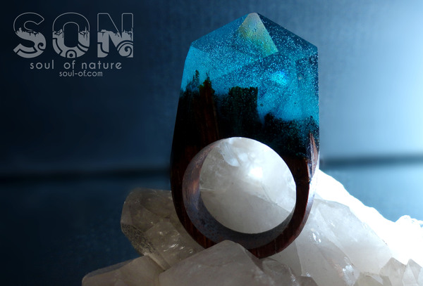 Вот и я решил сделать колечко из дерева и эпоксидной смолы. Внутри получилось изображение напоминающее гору усыпанную снегом. Снимал на телефон, за качество фото прошу не ругать.
