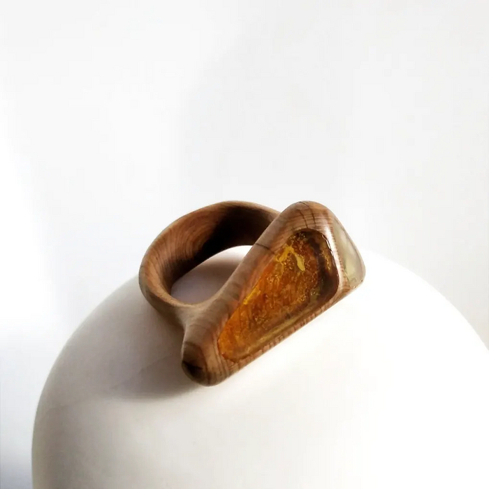 Всем привет! Немножко инкрустации янтарем по можжевельнику сегодня в архивах, недавно сделал это кольцо, (пардон за качество фото) вышло довольно интересным. Нужно было сделать кольцо "созвучным" другим имеющимся у заказчика украшениям, от этого такая форма кольца и янтаря. Можжевельник собран в горах уже сухим, сгорел в лесном пожаре лет 10-15 назад. (судя по молодым сосенкам вокруг) Пусть будет тут, напоминает почаще делать подобные вещи, колье например подобных обводов.