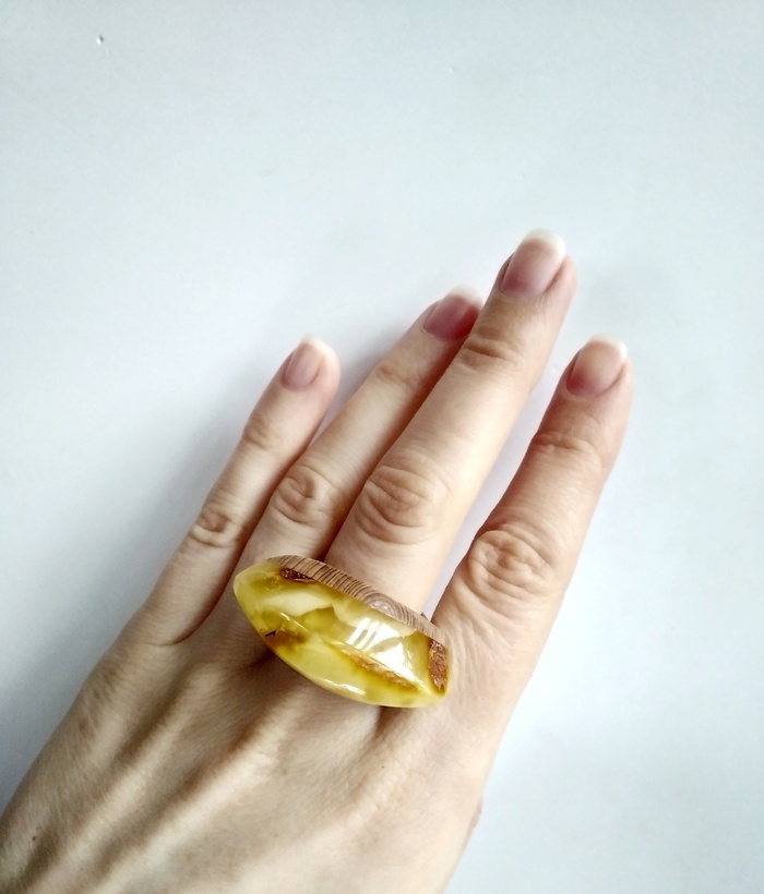 Доделал колечко, захотелось выложить не дожидаясь дневного света, и по сему сфотографировал на телефон, как смог, под лампой) На фоне материалы, как они выглядят "до" - можжевеловая ветвь и необработанный янтарь, а также веточка папоротника для красоты.