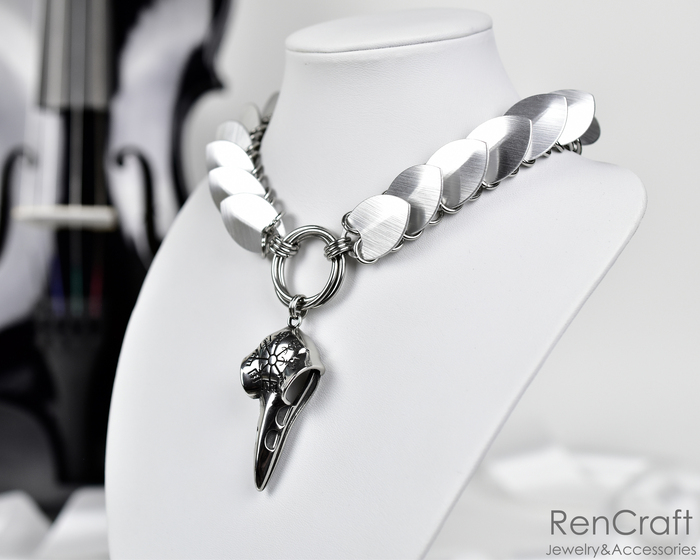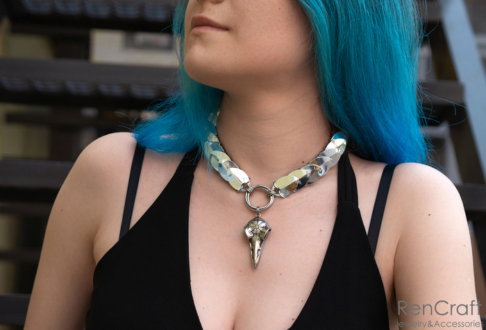 В чокере используются кольца из медицинской нержавеющей стали и чешуя из анодированного алюминия. Оба этих металла гипоаллергенны, не вызывают раздражения на коже, не боятся воды и не темнеют со временем.