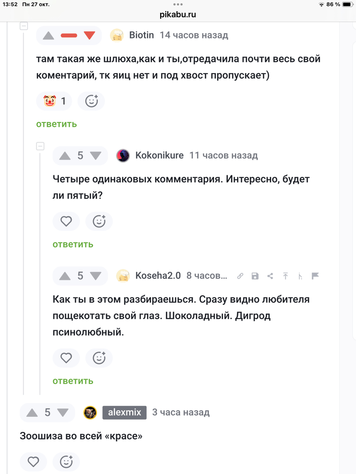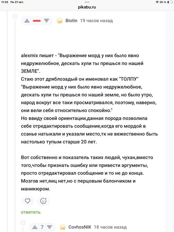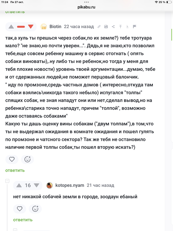 Человек( хотя, после того, как он озвучил, точнее высрал свои убеждения, я бы не называл его человеком) с ником @Biotin буквально вывалил на меня и других комментаторов, высказывающих мнение, что бродячим собакам- убийцам не место на улицах наших городов целый ушат мта, оскорблений и прочего словесного поноса.