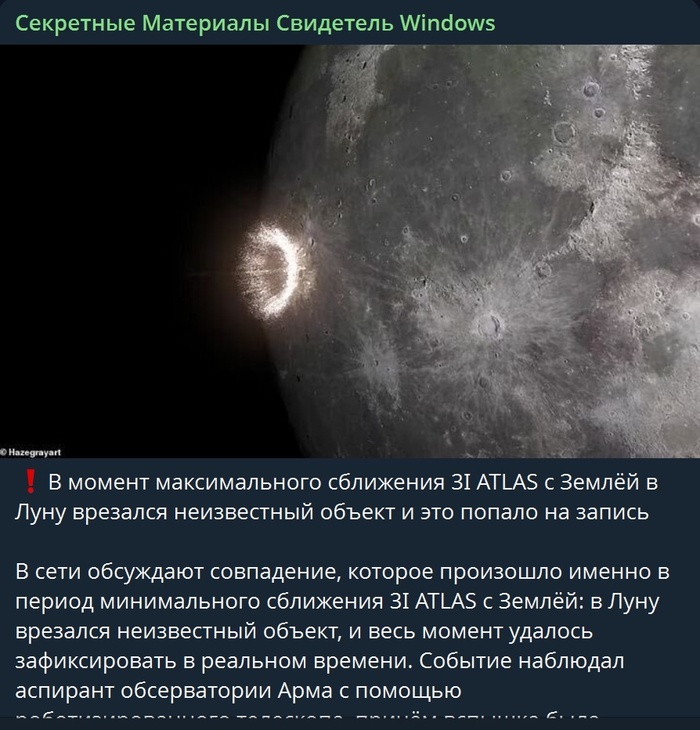 В момент максимального сближения 3I ATLAS с Землёй на Луне зафиксировали удар неизвестного объекта и это попало на видео https://dzen.ru/a/aUU8izsYcxGIq6O7