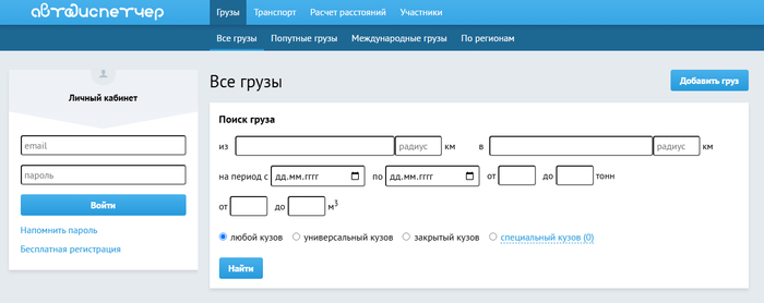 После регистрации вы можете размещать объявления о свободном транспорте или искать грузы, соответствующие вашим возможностям.